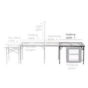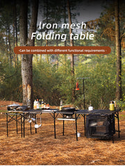 โต๊ะโลหะแบบพับได้ พื้นโต๊ะเป็นตะแกรงทำความสะอาดง่าย ปรับความสูงได้ 2 ระดับ เหมาะสำหรับใช้งานในแคมป์ สามารถนำอุปกรณ์เสริมมาต่อเข้าได้ให้กลายเป็นชุดโต๊ะครัวที่สมบูรณ์แบบ