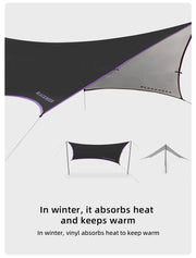 ทาร์ปขนาดใหญ่ 4.5x5.5 เมตรที่มาพร้อมเสาความสูง 2.5 เมตร เนื้อผ้าเคลือบสารช่วยสะท้อนความร้อน ลดอุณหภูมิภายใต้ทาร์ป สามารถใช้งานได้ทั้ง 2 ด้าน จะให้สีดำหรือสีเงินอยู่ด้านบนก็ได้ เลือกสีให้เข้ากับแคมป์ของคุณ