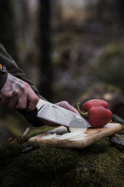ด้ามมีดออกแบบโดยได้รับแรงบันดาลใจจากด้ามมีดกลางแจ้งแบบดั้งเดิมของ Helle ที่มีลักษณะบวมที่กว้าง และให้การจับที่สบายและมั่นคง ทำให้คุณสามารถรับมือกับความท้าทายในการทำอาหารได้อย่างมั่นใจ บูสเตอร์ระหว่างด้ามกับใบมีดที่แบนราบช่วยให้การจับด้านหน้ามั่นคงเมื่อคุณหั่นหัวหอมหรือผักอื่นๆ ในขณะที่การจับเต็มตัวช่วยให้การหั่นง่ายและสบายในการทำงานหนัก ด้ามมีดทำจากวัสดุที่เราชื่นชอบ – ไม้เบิร์ชคลื่น ไม้เบิร์ชมีคุณสมบัติต้านแบคทีเรียที่ดี ให้ความรู้สึกที่ยอดเยี่ยมในการจับ และลวดลายที่เป็นเอกลักษณ์ของไม้เบิร์ชคลื่นทำให้ไม่มีมีดสองเล่มที่เหมือนกัน