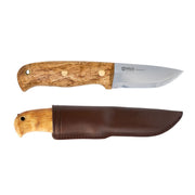Helle Wabakimi มีดสำหรับใช้งานกลางในขนาดที่กำลังดี Wabakimi มาพร้อมกับโครงสร้างแบบ half-full tang ทำให้มีดใช้งานได้ดีกว่าในสภาพอากาศหนาวเย็น ด้ามไม้เบิร์ชขัดด้วยมือจนเป็นผิวซาตินที่สวยงาม รูปทรงเรียบและโค้งมน มีดมาพร้อม ปลอกหนังคลาสสิกสำหรับพกพาในเข็มขัด
