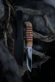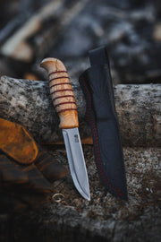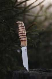 Helle 676 JS ใบมีดยาว 4.33 นิ้ว เหล็ก Sandvik 12C27 Satin Laminated ด้ามทำจากไม้ Curly Birch สร้างขึ้นโดย Svein-Erik Helle มาพร้อมซอง Helle พิมพ์สไตล์ดั้งเดิมจากปี 1930 ทำด้วยหนังสีน้ำตาลแบบคลาสสิกพร้อมการเย็บสีขาวเพื่อให้เข้ากับเขากวาง