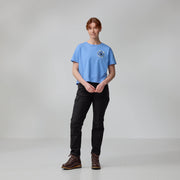 เสื้อยืดแขนสั้นผ้าฝ้ายออร์แกนิกพิมพ์ลายดอกไม้ภูเขาสวีเดนสวยงามที่ด้านหน้า ตัดเย็บแบบครอปเล็กน้อยพร้อมคอกลม เหมาะสำหรับวันฤดูร้อนที่อบอุ่นและพักผ่อนกลางแจ้ง